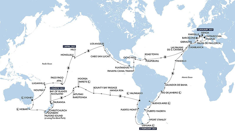 World Cruise 2027 tar sin början i det magiska Medelhavet, där du får upptäcka de kulturhistoriska skatterna i Frankrike, Spanien och Marocko. Därefter korsar du Atlanten via Kap Verde och kliver i land i Sydamerika, där pulserande städer som Salvador och Rio de Janeiro väntar.